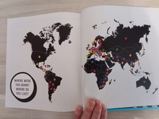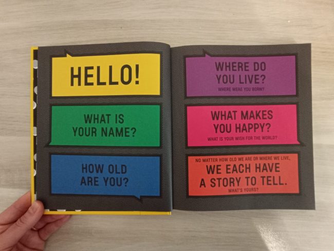 Cada página corresponde a una persona que saluda en su idioma y se presenta respondiendo a seis preguntas. ¿Cómo te llamas?¿Cuántos años tienes? ¿Dónde vives? ¿Dónde naciste? ¿Qué te hace feliz?¿Cuál es tu deseo para el mundo?