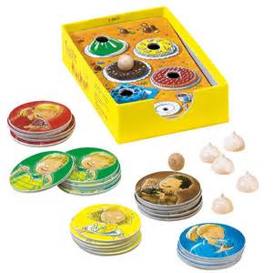 -La memoria la trabajamos porque como he dicho antes, hemos versionado la forma de jugar. Con las cartas redondas (que nos indican a qué pastel hemos de llegar con la pelotita) hacemos un memory. Te dan 25 cartas, nosotros las ponemos boca abajo como en un juego de este tipo. El jugador que tiene el turno levanta una carta, le sale el dibujo de un niño con el pastel donde ha de llegar con la pelotita. Si lo consigue se guarda la carta (cuando tenga tres iguales la podrá cambiar por una porción de nata), si no lo consigue, la vuelve a poner boca abajo. En el juego van unas fichitas de madera que se llaman porciones de nata (las que he nombrado antes) cuando jugamos nosotros, el objetivo es conseguir el máximo número de estas porciones. ¿Cómo conseguimos las porciones de nata? Con tres discos iguales (ahí la necesidad de recordar dónde se encuentran los discos de cada pastel que dejan los jugadores que no han conseguido llegar a su objetivo).