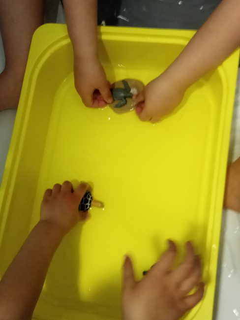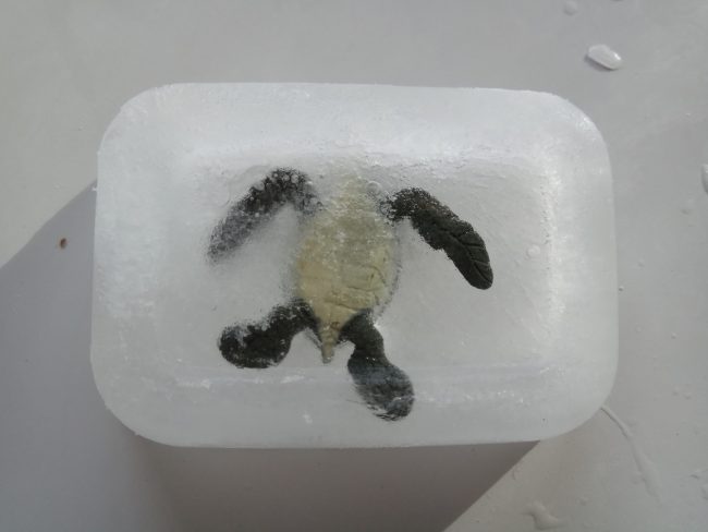 Mientras ellos intentaban derretir el hielo, yo les iba contando cómo las tortugas ponen huevos en la arena de la playa, cuando nacen, van arrastrándose hasta el mar y comienzan a vivir la gran aventura de la vida. Les conté lo que suelen comer, cómo es su anatomía y los peligros que las acechan desde que rompen el cascarón del huevo. También les hablé de cuando vuelven a la playa donde nacieron normalmente para poner huevos y reproducirse (esto les encantó).