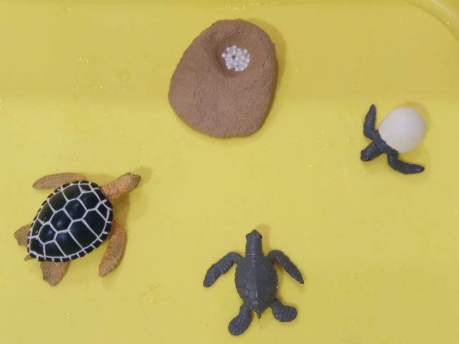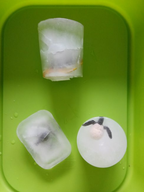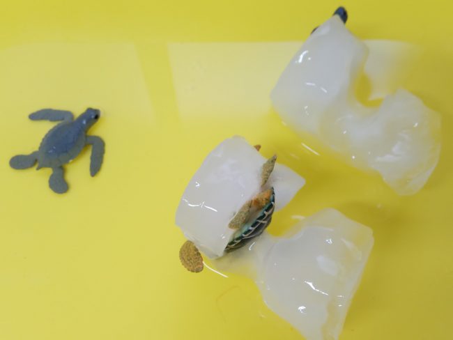 El año pasado compré el Ciclo vital de la tortuga marina de Safari LTD y el puzzle Montessori de la tortuga y pensé en congelar las miniaturas del ciclo de la tortuga para explicarles el ciclo y, de paso, hacer un juego sensorial.