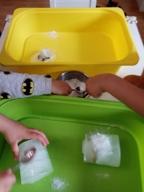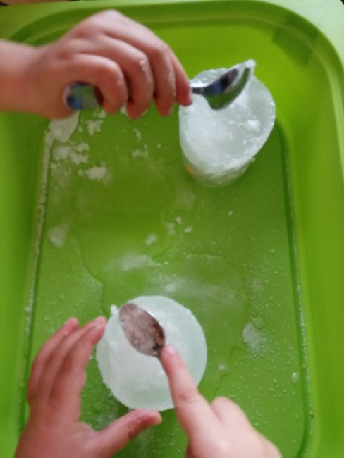 Al día siguiente saqué las miniaturas congeladas de los tupper, las metí en una bandeja y dejé a su alcance varias ideas que podían ayudar a derretir el hielo: agua caliente, sal, unas cucharas…