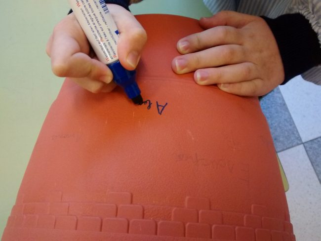 Una vez que recopilamos todas las palabras, cada niño anotó la palabra que había sugerido en la maceta con un rotulador permanente.