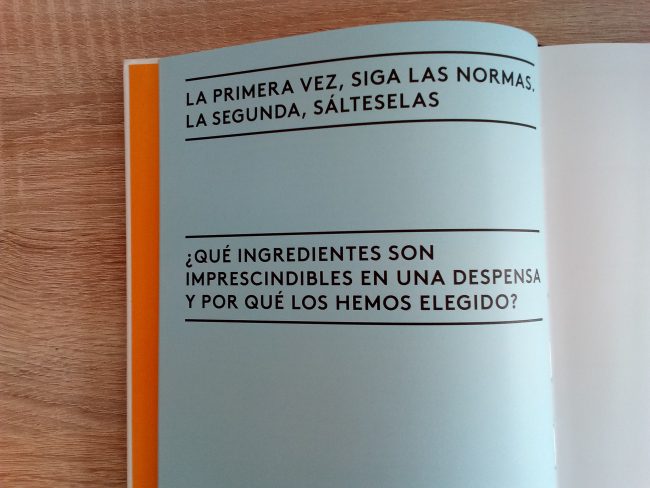 Me encanta el primer enunciado porque al seguir la «norma», la receta, ves cómo se hace, qué te gusta y qué no… y cuando la vuelves a hacer puedes mejorar cosas, cambiar para que sea más de tu agrado. El segundo enunciado me gusta porque yo realmente me lo he preguntado muchas veces pero nunca me he sentado a escribir una lista con esos básico que debería tener siempre en casa. Es cierto que al leer el libro no coincido en todos pero me ha ayudado a hacer una lista, algunos que propone el libro no los he hecho míos (lo he cambiado por otros) y el resto (la gran mayoría) también forman parte de mis básicos así qué…¡ya tengo mi lista!