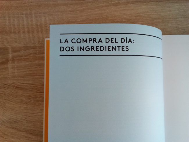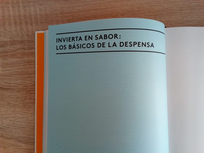 El libro parte de los alimentos que son imprescindibles en una cocina. A mi me cautivó con porque no suelo coincidir mucho en gustos con los libros de cocina (algunas o muchas de las recetas no me gustan) y mi gran sorpresa aquí fue que de los ingredientes de los que partía ¡me gustaban casi todos! Luego cuando descubrí que teniendo esos alimentos «en el fondo de armario» solo tienes que comprar al día dos alimentos pensé: ¡no está mal!