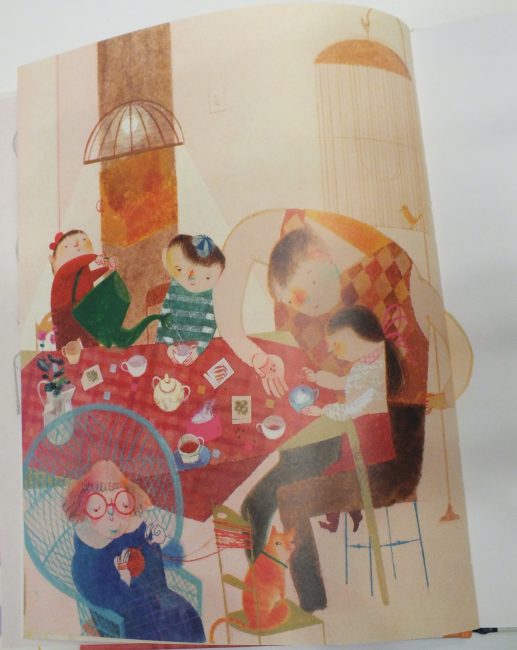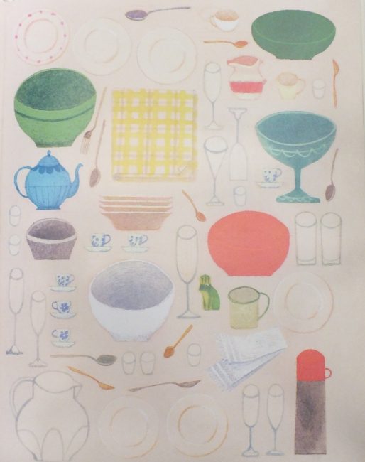 Pero no solamente de historias familiares habla este libro al pasar sus páginas, sino que también hay establecido un juego implícito en todas las hojas y que a mis hijos les ha gustado mucho, ir buscando y contando las piezas de la vajilla que se nombran en cada ilustración.