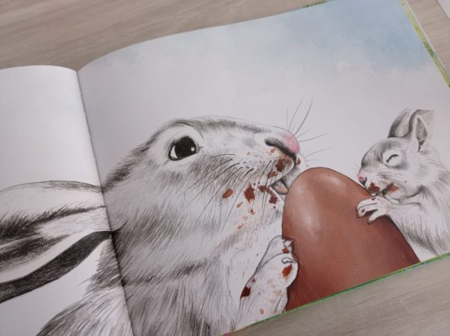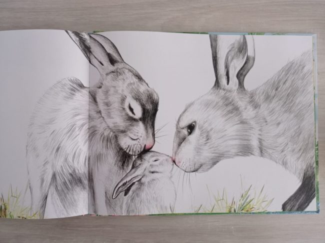 Las ilustraciones de Albert Asensio son una maravilla, todos los elementos y paisajes a color excepto la familia de liebres, dibujada con trazos de lápiz y de manera tan realista que parece que estés observando a una verdadera liebre en el campo.