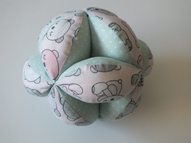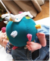 Cuando tienen algunos meses más y se mantienen sentados, se puede ofrecer la pelota a los bebés para que comiencen a explorarla introduciendo sus dedos en los orificios donde se juntan las piezas y haciendo sonar el cascabel de su interior, mejorando así a motricidad fina y la capacidad de agarre.