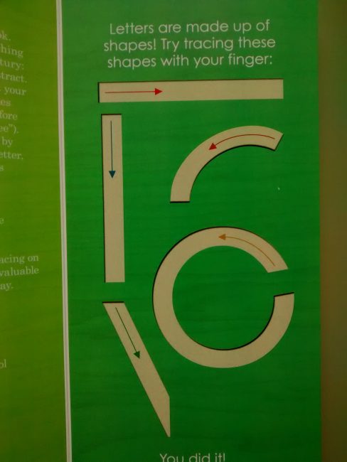 Me ha gustado mucho ver que en cada letra hay flechas con la dirección en la que se escriben dichas letras, sobre la lija, de manera que los niños pueden ver fácilmente hacia qué lado deben mover sus dedos al repasarlas, además, las letras del libro están ordenadas según la dirección con la que se escriben, no en orden alfabético.