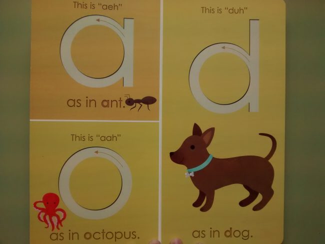 El libro del que os hablo hoy es éste, Montessori letter work, de Bobby and June George. Contiene imágenes sencillas y bonitas asociadas a un fonema y a una letra que viene impresa en papel de lija, aunque hay que tener en cuenta que como el libro es inglés, las palabras no se corresponden con las de castellano (octopus- O- pulpo- P), además, es muy económico.
