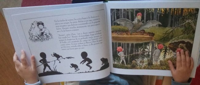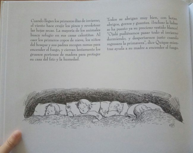 Las ilustraciones son muy detalladas, sorprendentes, dulces, muy descriptivas… nos trasladan hasta los países nórdicos, escandinavos, donde se extienden esos preciosos bosques, esos rincones de la naturaleza donde todo es posible. A lo largo del cuento podemos encontrar en las páginas de la izquierda dibujos en blanco y negro junto al texto, y en las páginas de la derecha están esas preciosas ilustraciones a color.