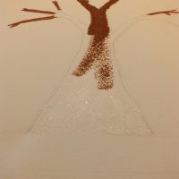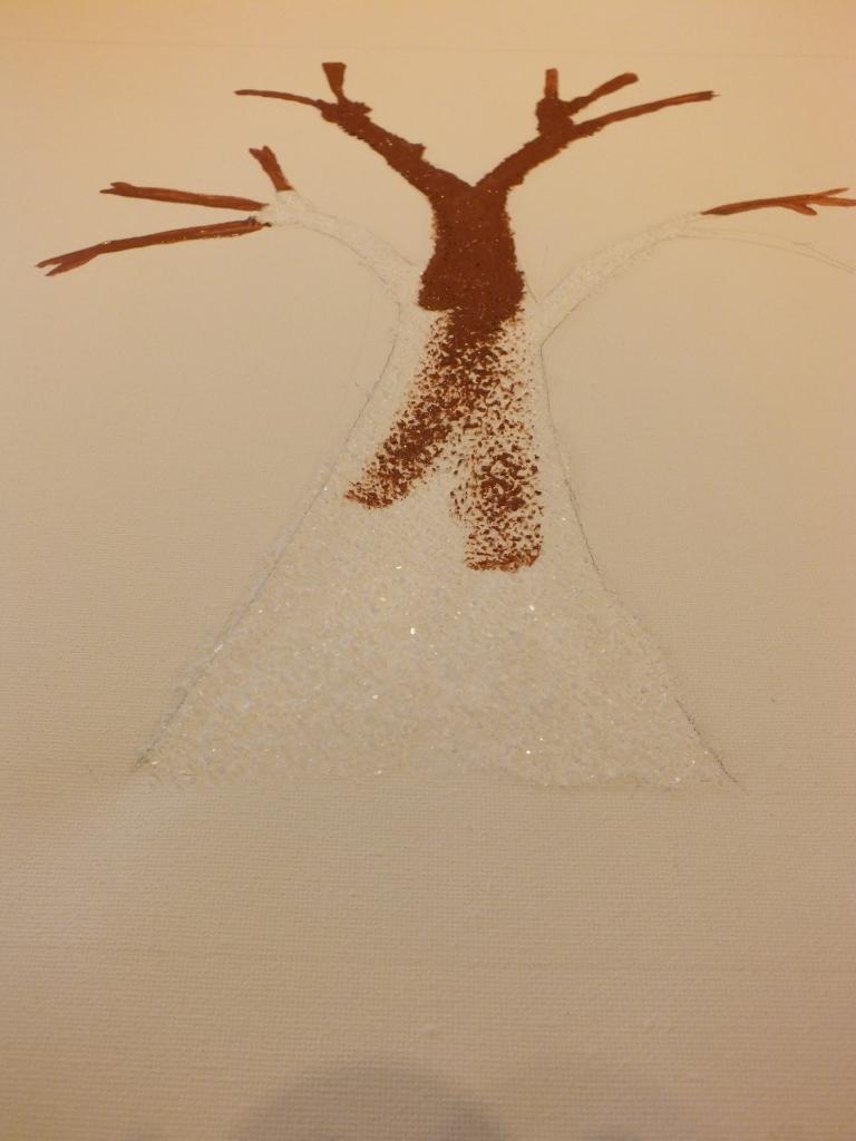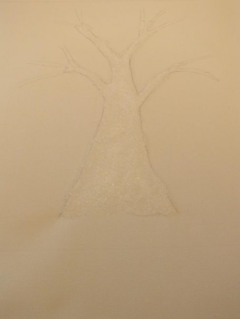 Debo decir que el regalo ha necesitado colaboración, no lo han hecho solamente los peques, pero me encanta cómo ha quedado. Compramos un lienzo, dibujé el tronco de un árbol con las ramas y le pusimos cola blanca encima, a continuación, le pusimos bastante sal encima de la cola y lo dejamos secar 24 horas.