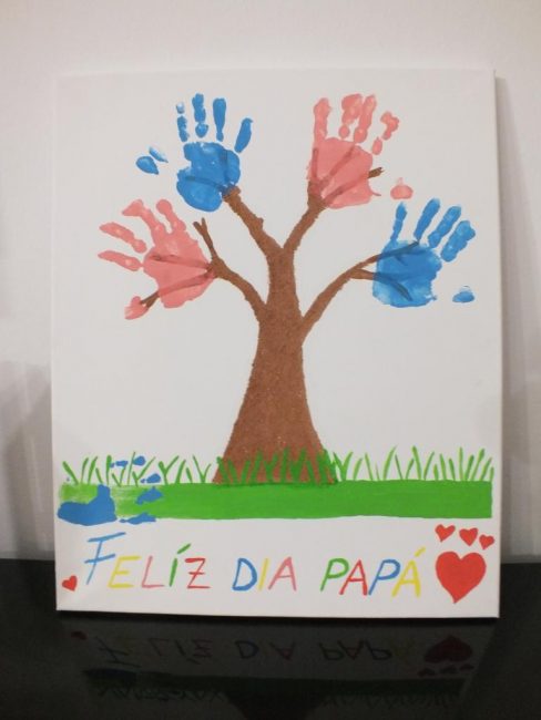 Cuando ya tenemos el tronco y las ramas pintados y secos, ya podemos acabar el lienzo. Los niños se pintaron las manos (adivinad cual es de cual, mira que yo soy poco de rosa y de azul, pero debe ser algo que se lleva en los genes porque no falla, el color favorito de mi hijo es azul y de mi hija el rosa) y las pusieron por las ramas a modo de hojas, y mi hijo decidió que había que plasmar de alguna manera la llegada del nuevo baby, así que abajo a la izquierda dibujó con la mano una especie de huella que a mí me pareció un pie de bebé (a mi padre le pareció una mancha hecha con la mano del niño y ya está XD).