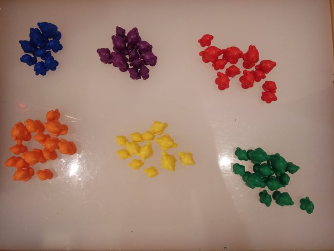 Para realizar estas actividades hemos utilizado un material que teníamos en casa, estos osos contadores. Este verano le resultaba complicado realizar actividades con ellos, sin embargo, ahora le resultan muy atractivos y puede aprovechar mejor el material.