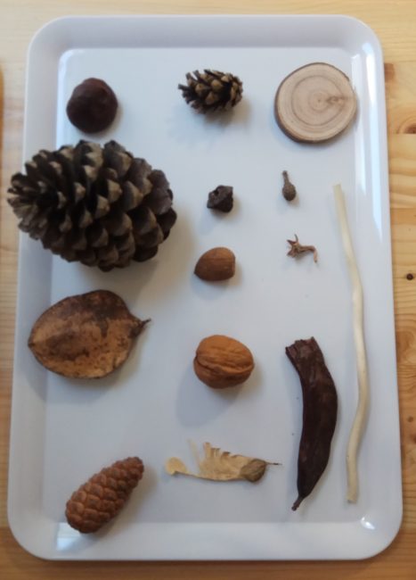 Mis hijos nos dijeron la semana pasada que querían tener más elementos que observar en su mesa de observación Montessori, de modo que fuimos de excursión a la montaña y recolectaron hojas, piedras, tierra… cuando eran más pequeños, los llevábamos a la playa e iban metiendo en una bolsa las conchas y caracolas que encontraban, cuando estábamos en el pueblo, cogían pequeños frutos dependiendo de la estación en la que nos encontrábamos, etc. Cuando llegaron a casa después de la excursión, se dedicaron a organizar todo lo que habían recogido en la excursión y a clasificarlo en la mesa.