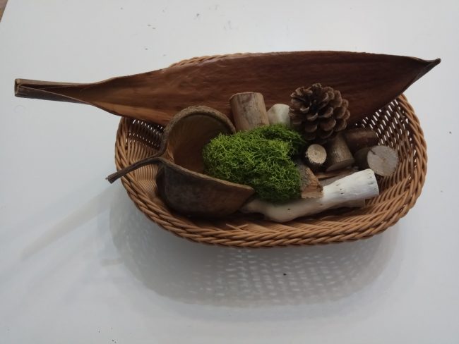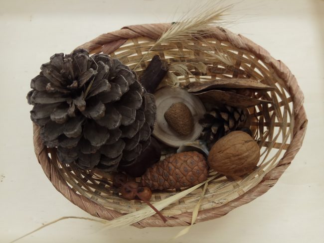 Algunos elementos de nuestra mesa de observación los hemos comprado en babycaprichos (como este cesto de elementos naturales que os enseño a continuación), otros los hemos recolectado de paseos, excursiones, etc.