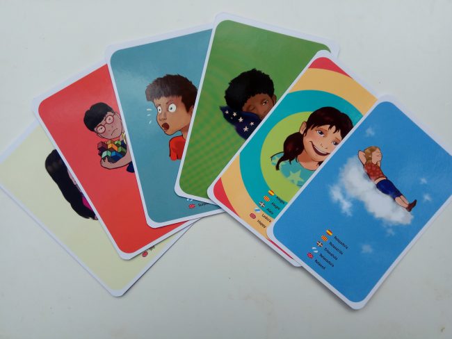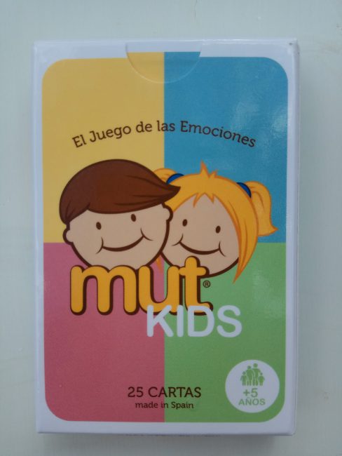 Mut kids es un juego formado por 25 cartas de 4 colores diferentes. Cada carta tiene una pregunta diferente relacionada con las emociones de los niños, para que puedan establecer una comunicación directa con sus padres o educadores y hablar de lo que les da miedo, lo que les hace estar felices, qué sentimientos tienen, qué sensaciones les producen dichos sentimientos… a mí me han sorprendido algunas de las respuestas que daban mis hijos cuando jugábamos.