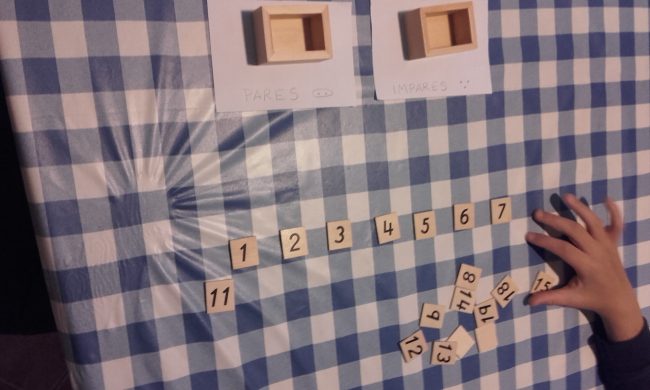 Esta actividad la hicimos varias veces. Hoy por hoy aún no ha adquirido ni generalizado el concepto pero sabe que hay unos números que son pares, otros que son impares y que todo esto tiene algo que ver con las parejas. No sé hasta donde llegará o si lo entenderá algún día pero lo cierto es que le ayuda a descubrir nuevos conceptos, a indagar, a crecer…