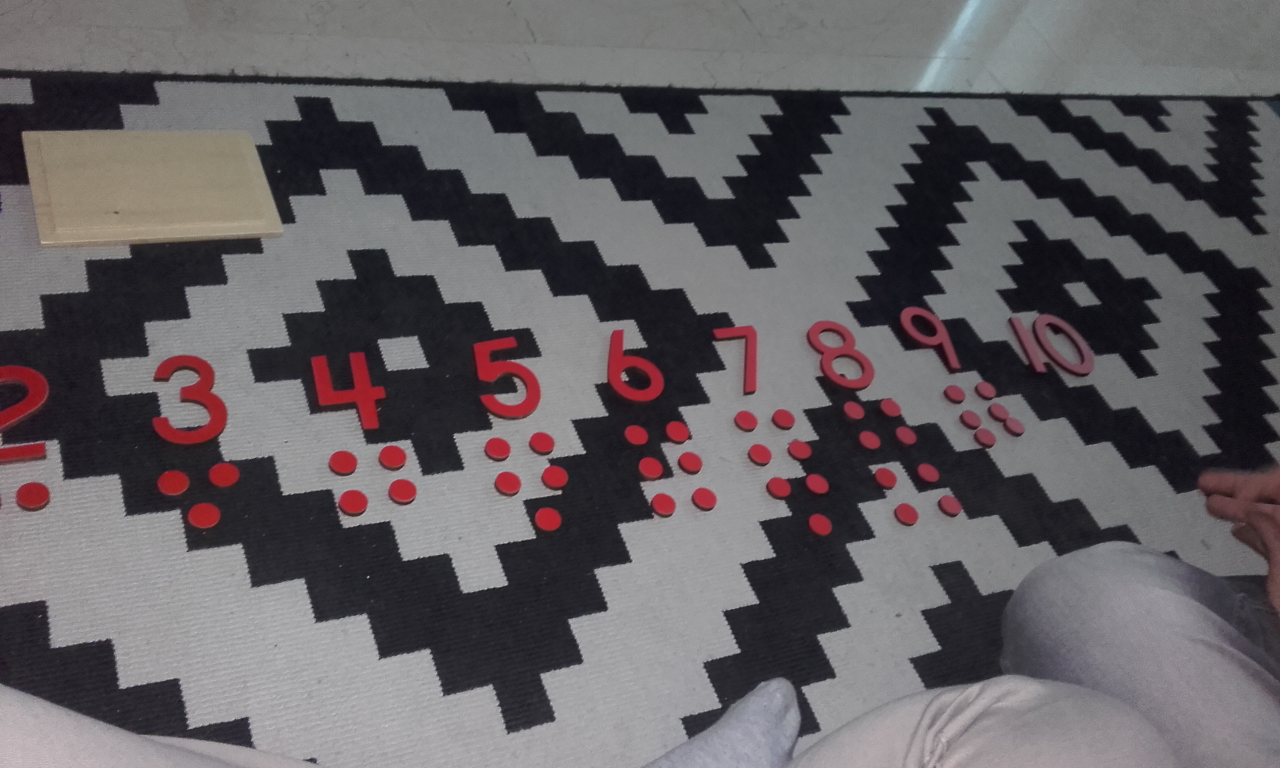 - Una vez ya estaban colocados los contadores debajo de los números fuimos pasando el dedo índice entre las dos columnas de contadores. En orden, despacio y fijándonos.