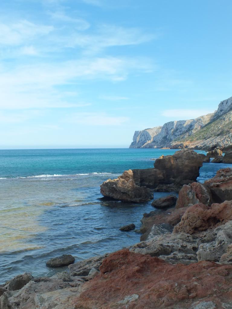 Hemos estado en la playa y en la montaña 🙂 a gusto de todos. Fuimos un día a Denia, a una playa preciosa que no recordaba así. Super papi creció en Denia, y todas las semanas iba a la playa de Les Rotes, así que cuando éramos novios me llevó allí, pero el recuerdo que yo tenía de esa playa era que me había hecho daño en los pies porque era playa de piedra y que olía muchísimo a algas marinas (olor que me desagrada en sobremanera), pero el otro día todo fue diferente.