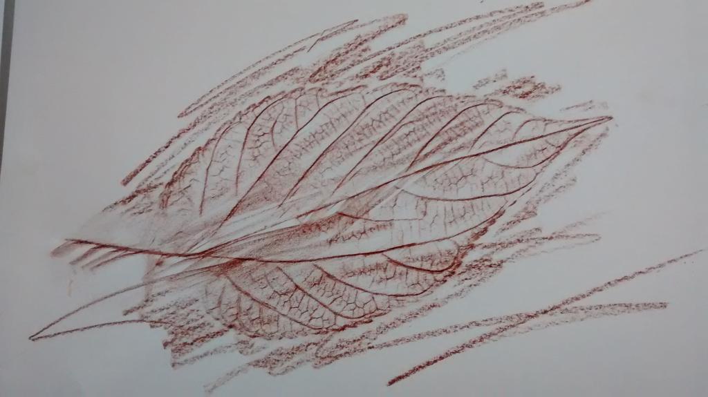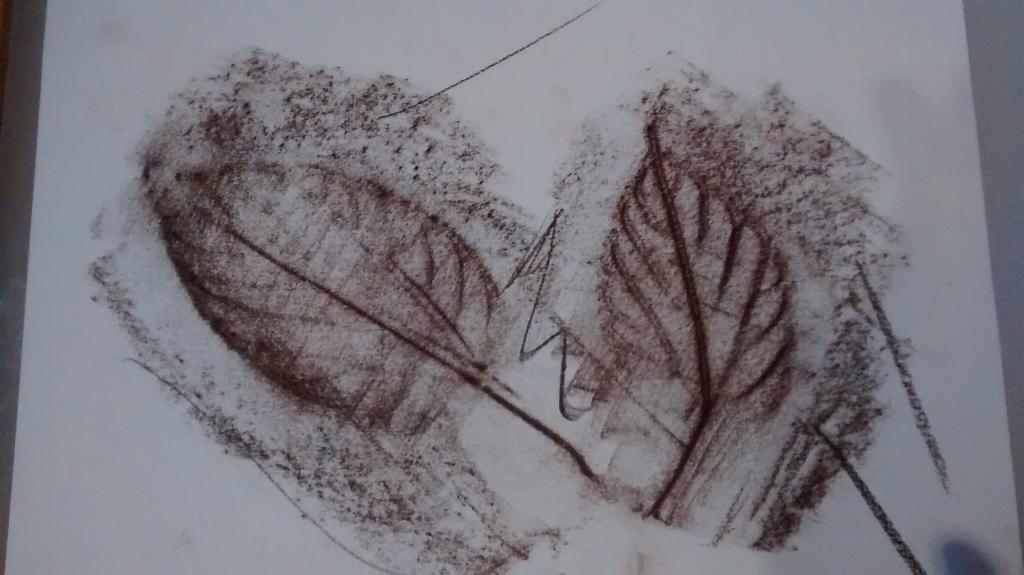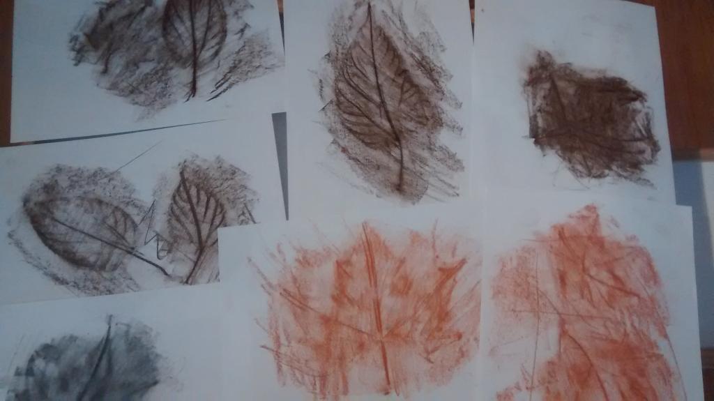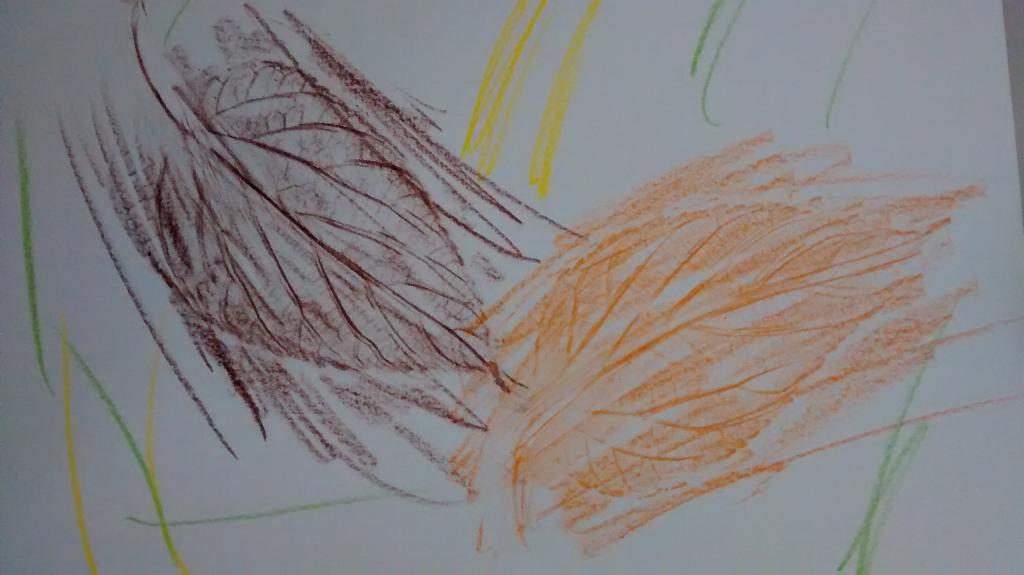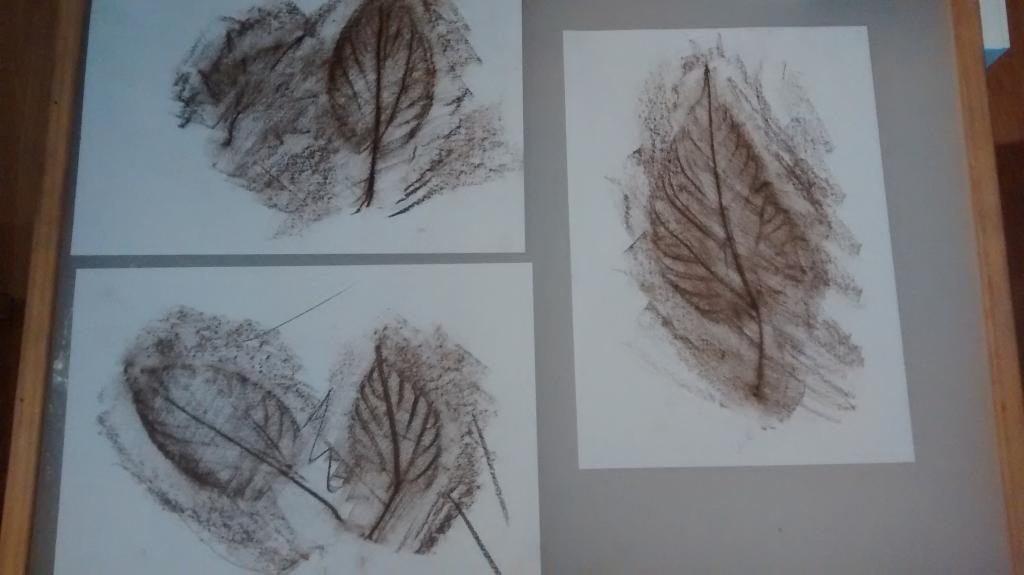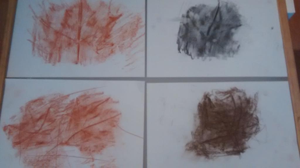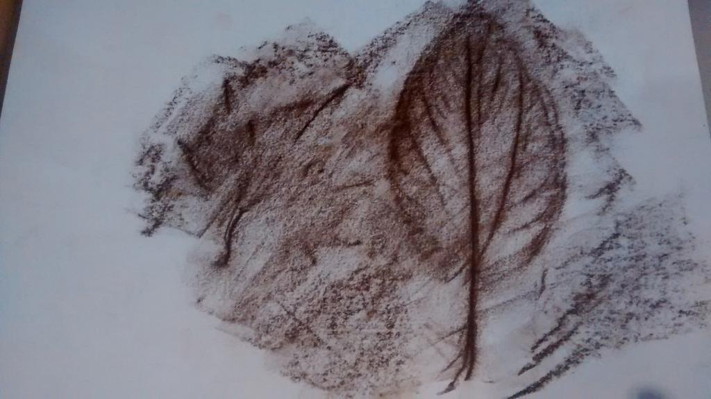 Cogí un folio y lo coloqué encima de la hoja, les mostré cómo debían sujetar con una mano el folio y con otra repasar por encima del folio la hoja con los carboncillos o las tizas y les dí folios para que lo hiciesen así si querían. Me daba lo mismo si salían dibujos más o menos bonitos, lo que quería era que experimentasen con los materiales y utilizasen otras técnicas.