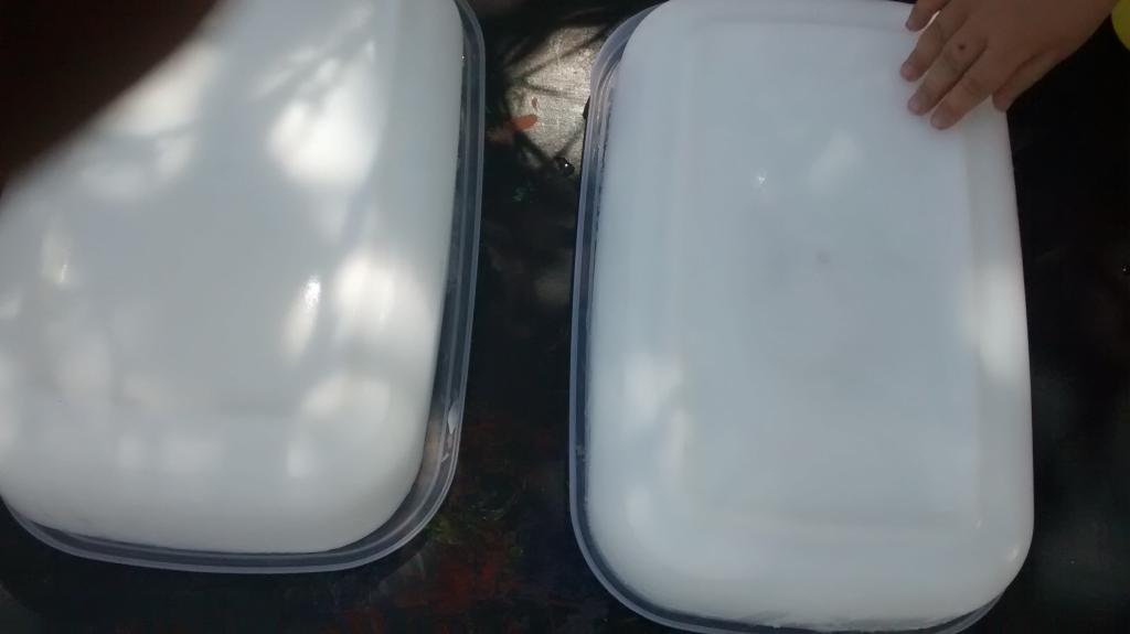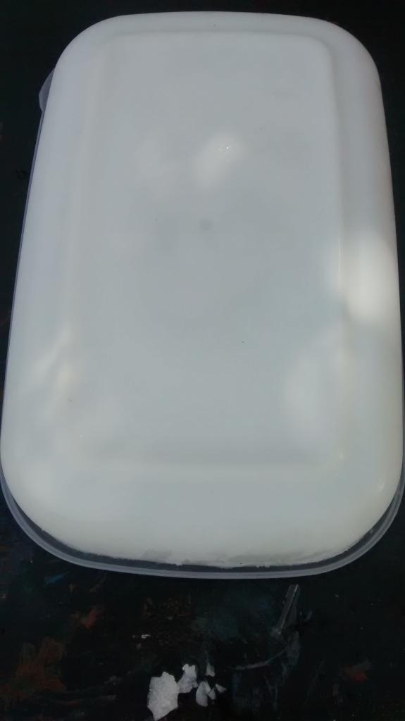 Es muy sencilla, ponemos un bote de bicarbonato en el fondo de un tupper/recipiente alargado (si el recipiente es pequeño, medio bote será suficiente). Luego añadimos agua al recipiente y, sin remover, lo metemos al congelador 24 horas.