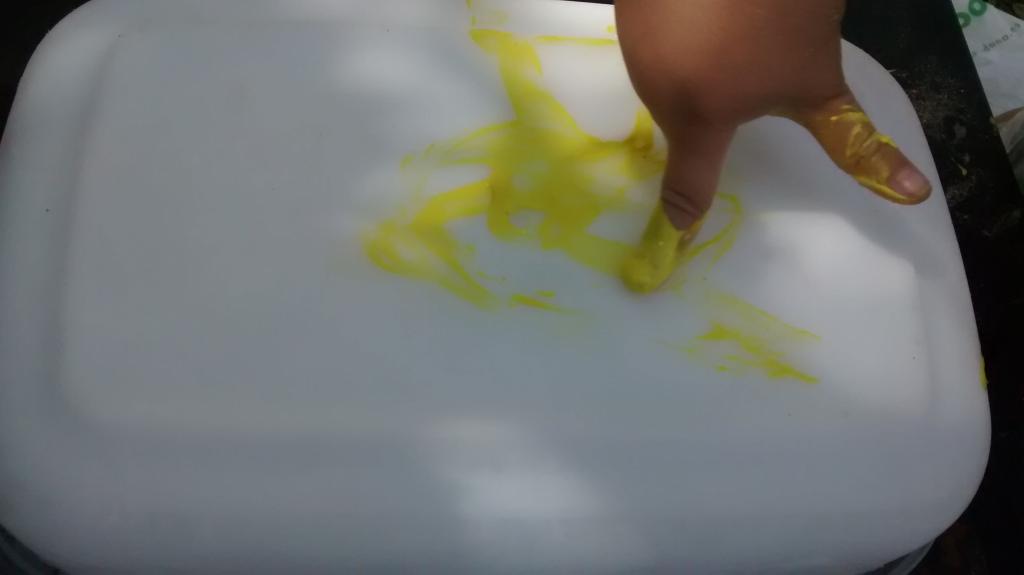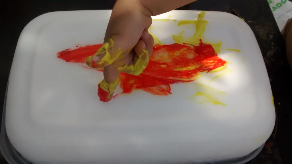 Nuestra vecina, que es un poco más mayor, vino a visitarnos y se quedó a pintar, así aprovechamos la pintura sobrante… les encanta a todos los niños.