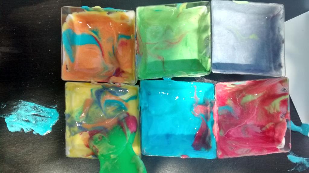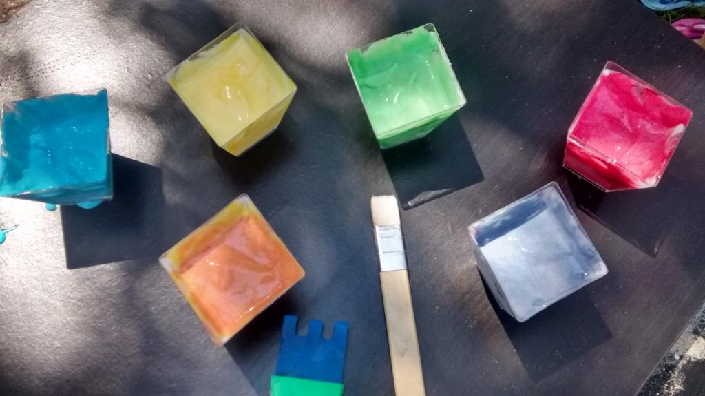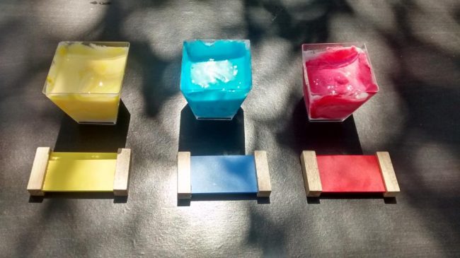 Luego dividimos la masa en tantos recipientes como colores queramos obtener. Añadimos a la masa unas 20 gotas de colorante alimenticio del color que queramos, volvemos a mezclar bien y… ¡a pintar!