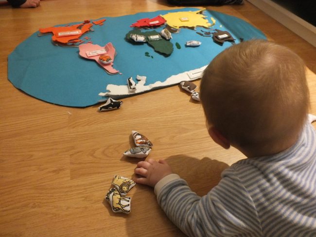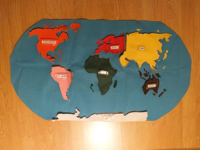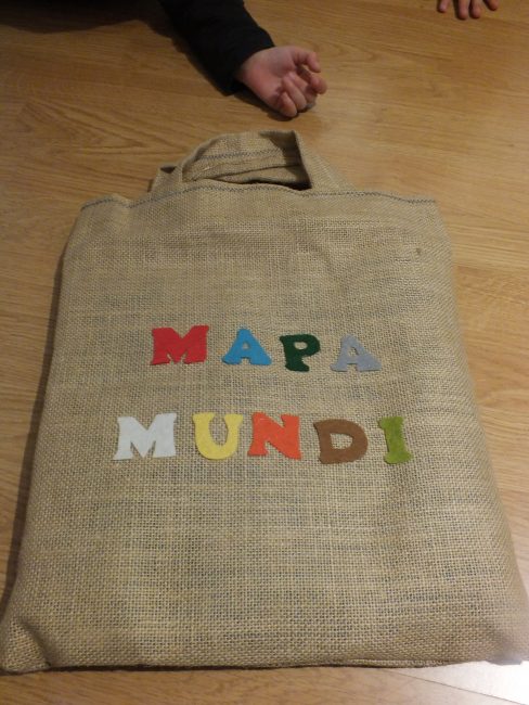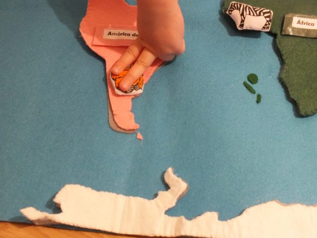 Por otra parte, comencé a recortar y preparar un mapa de fieltro antes de que naciese el bebé, pero el tiempo se me echó encima y no pude terminarlo, así que encargué uno a Montessori en tu casa y ese es el que utilizamos. Todas las piezas del mapa son de fieltro y se adhieren unas a otras mediante belcro. El mapa viene en una bolsa de tela con asas para guardarlo que reza «MAPA MUNDI».