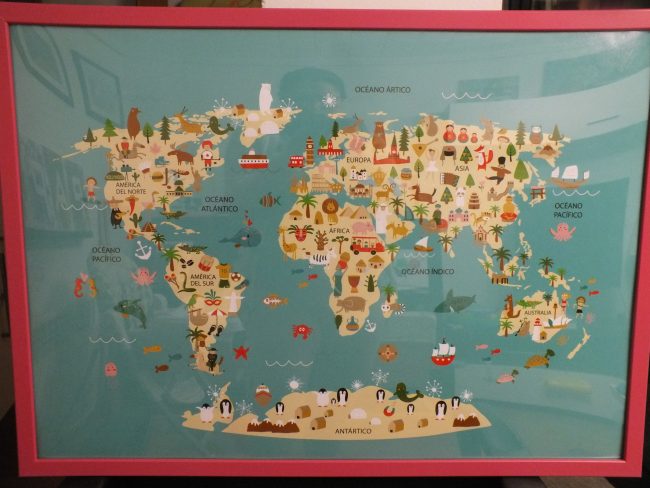 En Navidades los Reyes les trajeron una lámina del mapa mundi que enmarcamos, lleno de información dibujada de cada país (animales, monumentos, personas, comida, etc.), es de Menudos Cuadros y también lo tienen en forma de vinilo para la pared, nada más enmarcarlo me preguntaron que dónde estaba Bretaña, dónde estaba Bélgica, Noruega… comenzaron a preguntar por los lugares de residencia o procedencia de todos nuestros amigos. Nos gusta mucho esta lámina porque aporta mucha información a los niños mediante imágenes, y la pueden manejar fácilmente.