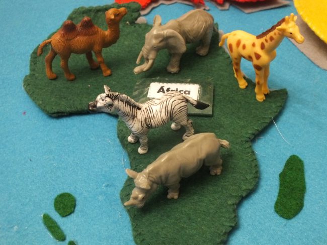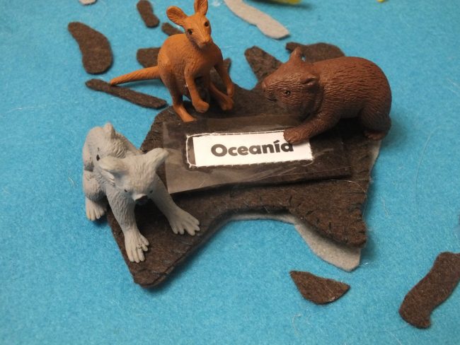 Fueron fijándose en la lámina y comparando el mapa de fieltro con el atlas y la lámina, y conforme descubrían un animal que coincidía con los de tela, lo iban colocando en el mapa. De la misma marca de los animales de tela, también hay monumentos del mundo, banderas del mundo y personas del mundo, aunque debo de decir que dan más juego las miniaturas de Safari.