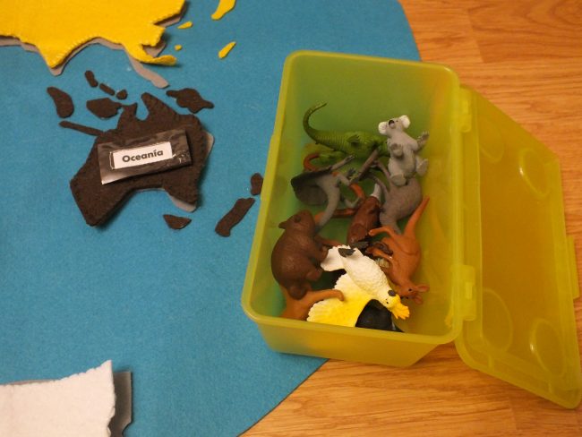 Cuando acabaron de colocar los animales de tela, querían más, más animales, más información, más sed de conocimiento con necesidad de ser saciada. Así que compramos miniaturas de Safari Ltd para cada continente, para jugar con el mapa, a otros juegos… continuamos aprendiendo mucho más, cómo se llaman las personas de cada continente, averiguamos si conocemos a alguien que viva o que haya viajado allí, cómo son las casas de esos continentes, qué tipo de ropa utilizan, cómo son sus banderas, qué árboles y/o flores son procedentes de allí, la comida típica… Todas las dudas que les iban surgiendo hemos ido intentando resolverlas, trabajando siempre con una base manipulativa y lúdica, en este caso varios mapas, atlas y miniaturas, aunque también hemos utilizado el proyector, así como algunos imprimibles que subiré para que podáis descargar en los siguientes posts.