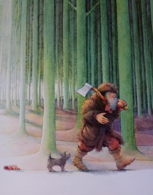 Un leñador va al bosque en pleno invierno a cortar leña acompañado de su perro y se le cae un guante en la nieve.