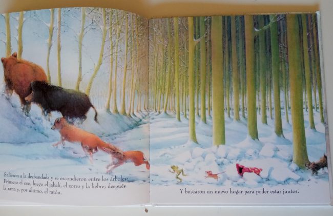Pero el leñador se da cuenta de que ha perdido un guante, le dice al perro que lo busque y, cuando la encuentra llena de animales, se pone a ladrar para avisar al hombre de que lo ha encontrado. Al darse cuenta de lo que sucede, todos los animales que estaban en el guante, salen para encontrar un nuevo hogar donde protegerse del frío invierno TODOS JUNTOS.