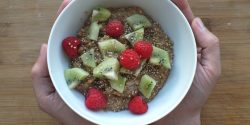 Receta de porridge de Amaranto, quinoa y avena con mantequilla de almendras, kiwis y frambuesas.