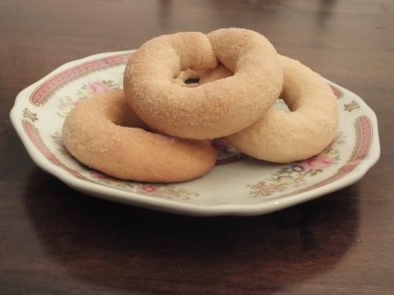 Precalentamos el horno a 180ºC. Pasamos los rollitos que hemos formado por azúcar, los ponemos sobre una lámina de papel vegetal en la bandeja de horno y horneamos a 180ºC durante 15 minutos aproximadamente. Pasados esos 15 minutos, pinchamos con un palillo los rollitos y si sale limpio el palillo, podemos sacarlos ya del horno, si no sale limpio, seguir horneando y comprobar cada 5 minutos.