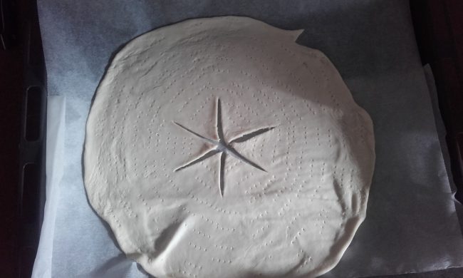 Hacer un bola con la masa y extenderla de forma circular. A continuación hacer tres cortes en el medio, como si estuviésemos haciendo un asterisco. Como era una masa prefabricada la pinché para que luego se hiciese bien (cuando no las he pinchado me da la sensación de que se quedan medio crudas)