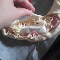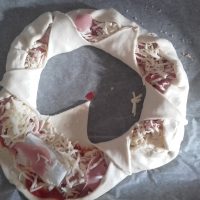 Una vez cerrada la corona, sobre los triángulos se enrolla el Bacon, creo que se podría hacer también con tiras de jamón serrano o de jamón york pero no lo he probado aún. Pienso que lo importante es enrollar algo sobre el triángulo para que cuando se esté horneando no se abra la masa y se deshaga. En el vídeo ponían bacon y eso lo he mantenido. Eso si… le di unas vueltas en el micro para que se hiciesen un poco las tiras porque nos gusta muy hecho y cuando he horneado bacon en alguna receta luego queda medio crudo. Luego añadí el pamplonés (lo tuve que recortar un poquito porque la loncha quedaba muy grande), la salsa barbacoa encima del bacon enrollado y por toda la corona trocitos de parmesano.