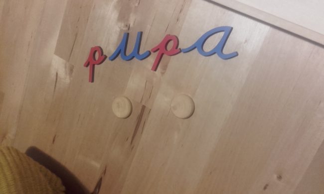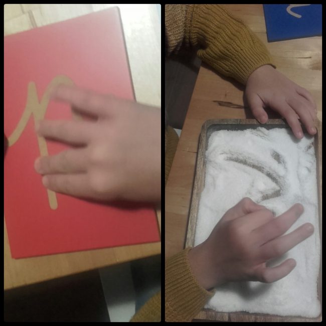 Como ya comenté, buscando, estudiando, investigando me topé con un material estupendo para niños que no hablan bien y están trabajando la lectoescritura: El método gestual de Promolibro. Además, quería materiales manipulables con los que él pudiese experimentar y “vivir” la escritura. Hablando con Patri de cómo conseguir las grafías de las letras en material manipulativo (porque no se encuentran en todos los sitios y me estaba desesperando), me enseñó dónde conseguirlas y además, las letras de lija que tenía. En ese momento me abrió una puerta maravillosa. Gracias a esto empecé y continúo descubriendo a Montessori de una forma integral, lo cual es FANTÁSTICO.
