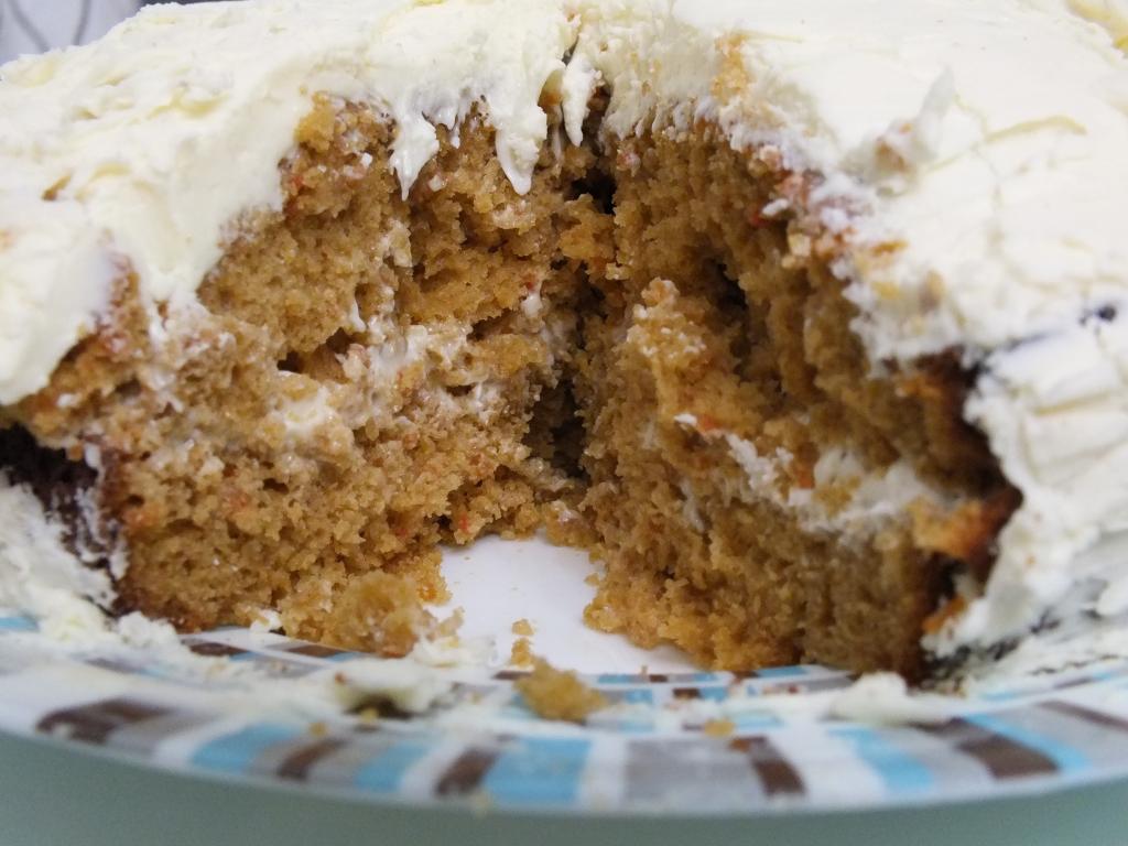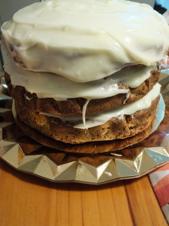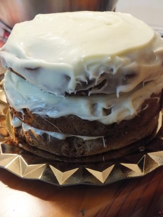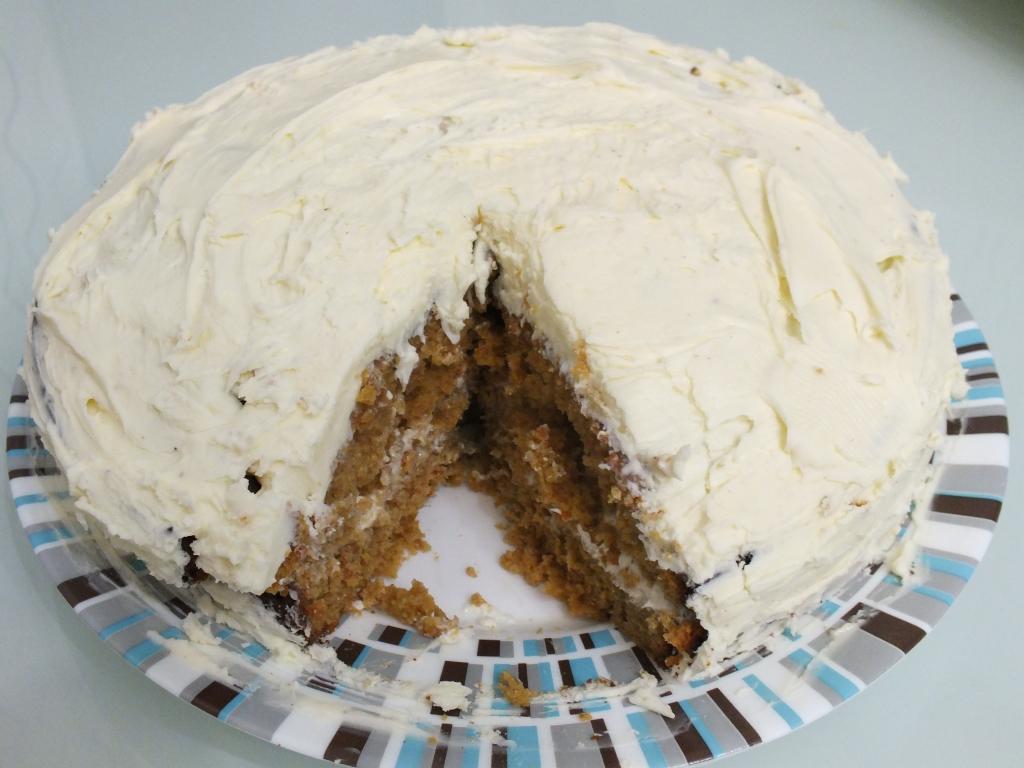 Colocamos la primera capa de la tarta y la cubrimos con una capa de frosting de queso de un dedo de grosor aproximadamente. Repetimos la operación con los otros dos bizcochos que nos quedan, de manera que la parte superior de la tarta estará cubierta con frosting de queso.