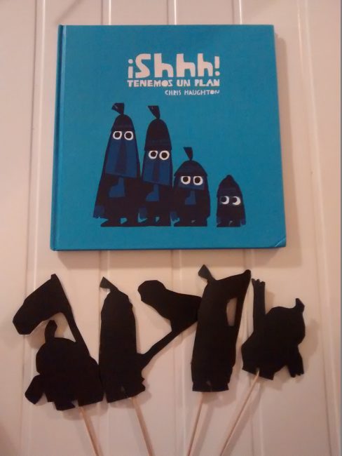 Finalmente, les dije a los peques que eligiesen un cuento para representarlo en el teatro de sombras y yo les haría las siluetas (mientras rezaba para que no fuesen unos personajes muy enrevesados de dibujar). Eligieron el cuento de “¡Shhh! Tenemos un plan” de Chris Haughton (el cuento del pajarito como lo llamamos en casa desde que nos lo descubrió un amigo, os hablé de él en esta entrada sobre Libros especiales para el día del libro) y, aunque no es el más fácil de dibujar, tampoco es el más complicado que podrían haber elegido, así que me puse manos a la obra.