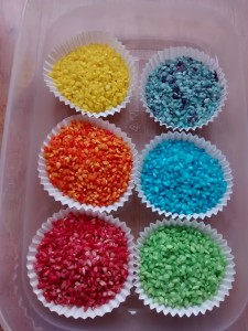 Por la mañana lo he colocado clasificado por colores en papeles de magdalenas para que lo vean ordenado, y todo dentro de un tupper. El arroz que me ha sobrado lo he metido en botes cerrados con tapa clasificados por colores para cuando se acabe esta tanda ir sacando más.
