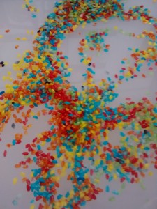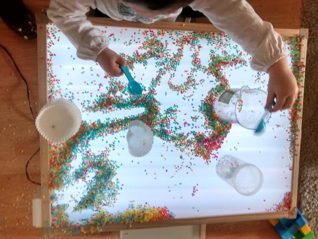Este fin de semana hemos jugado mucho. Uno de ellos el regalo del día del padre que ya os enseñaré cuando esté acabado, otro unas botellas sensoriales nuevas y otro este precioso arroz de colores u arroz arcoiris.