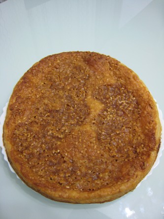 Mezclamos las almendras, el azúcar y la mantequilla. Repartimos esta mezcla cubriendo toda la superficie de la masa de hojaldre y horneamos unos 15 ó 20 minutos aproximadamente a 180ºC.