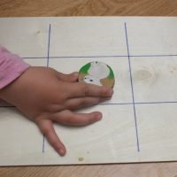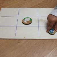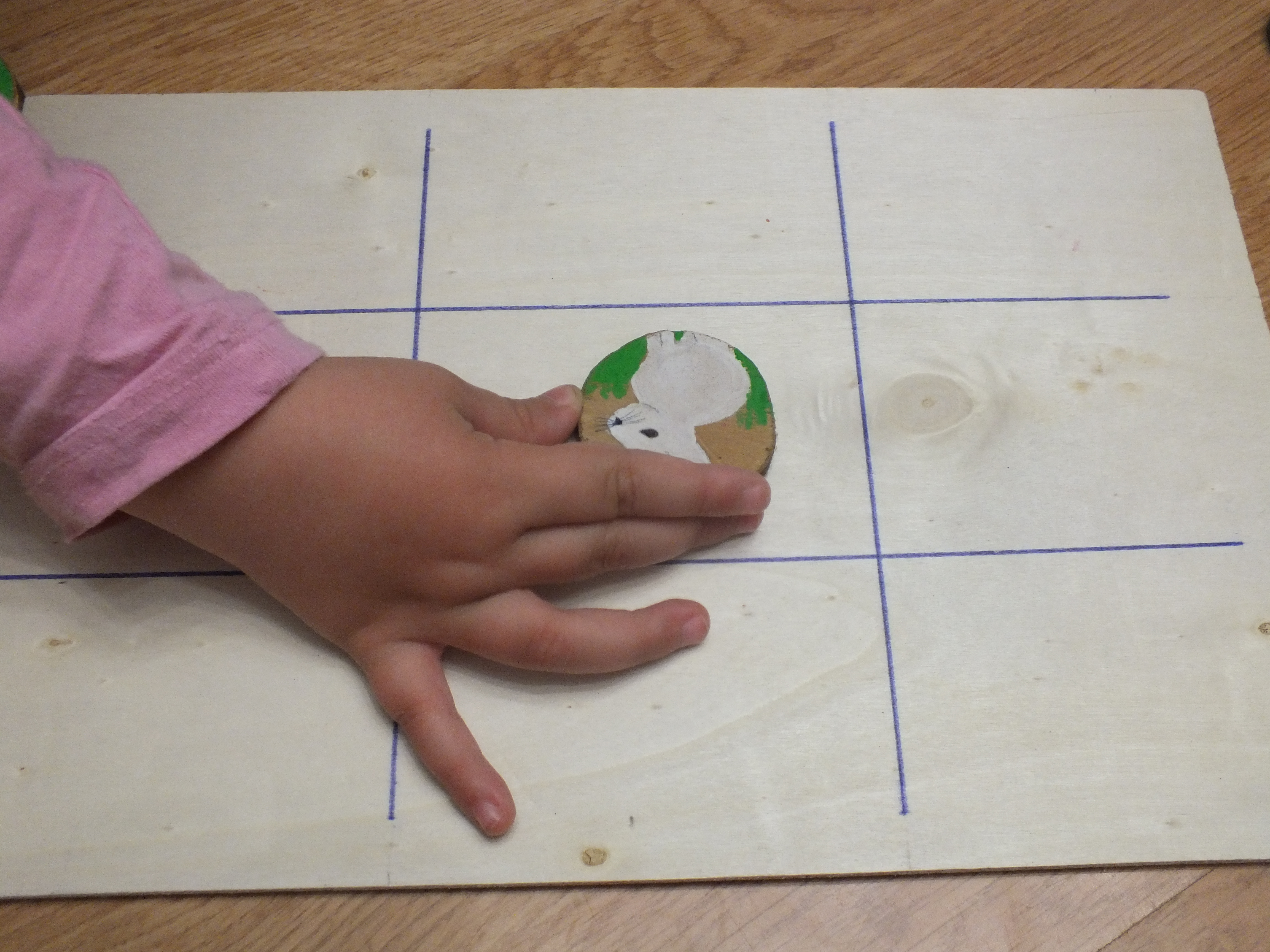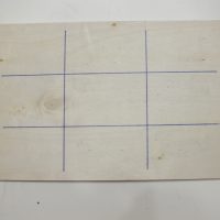 Para el tablero del tres en raya utilicé una chapa de madera pequeña que teníamos en casa de una manualidad que hicimos y nos sobró y la dividí en 9 celdas del mismo tamaño.