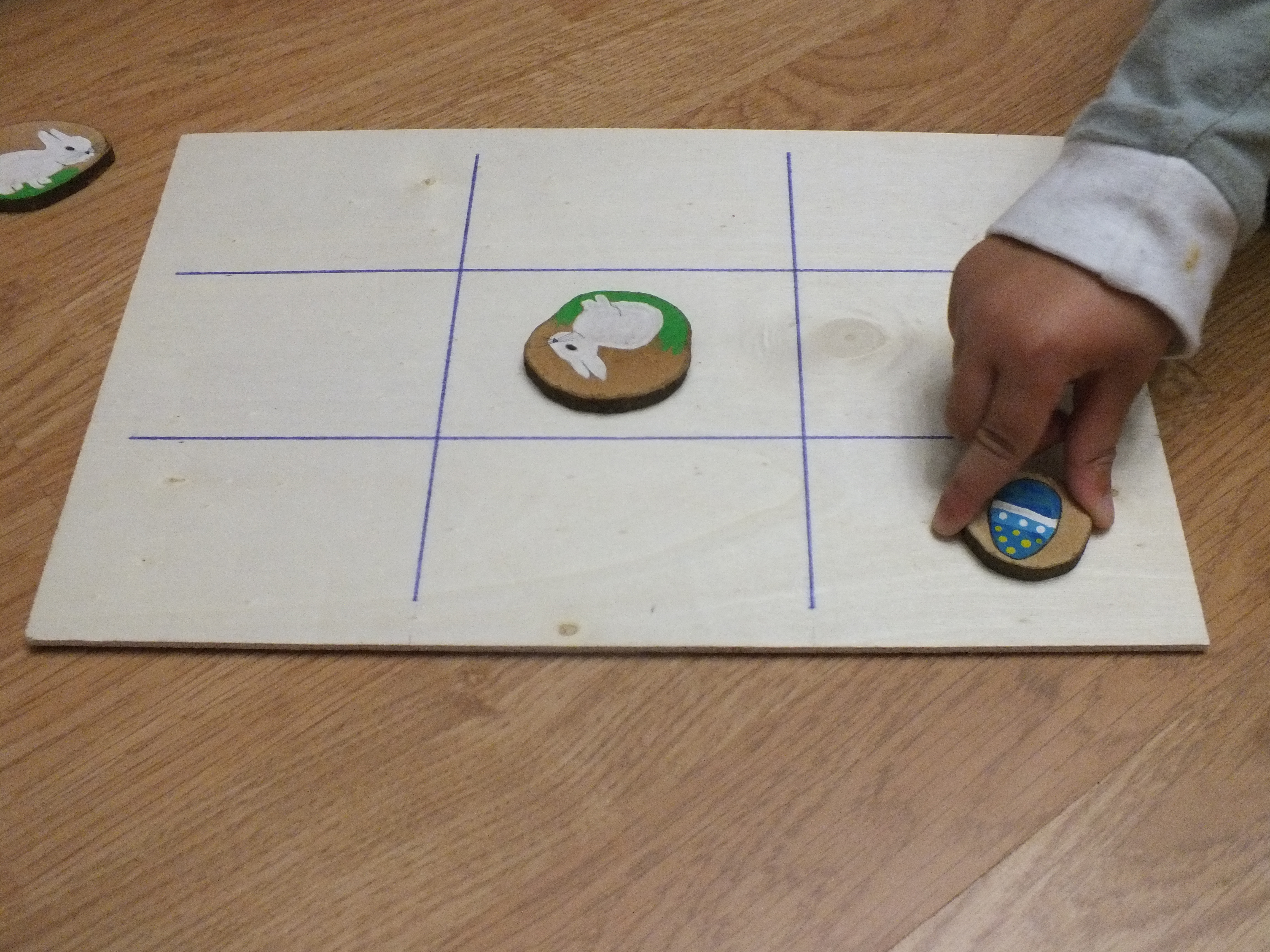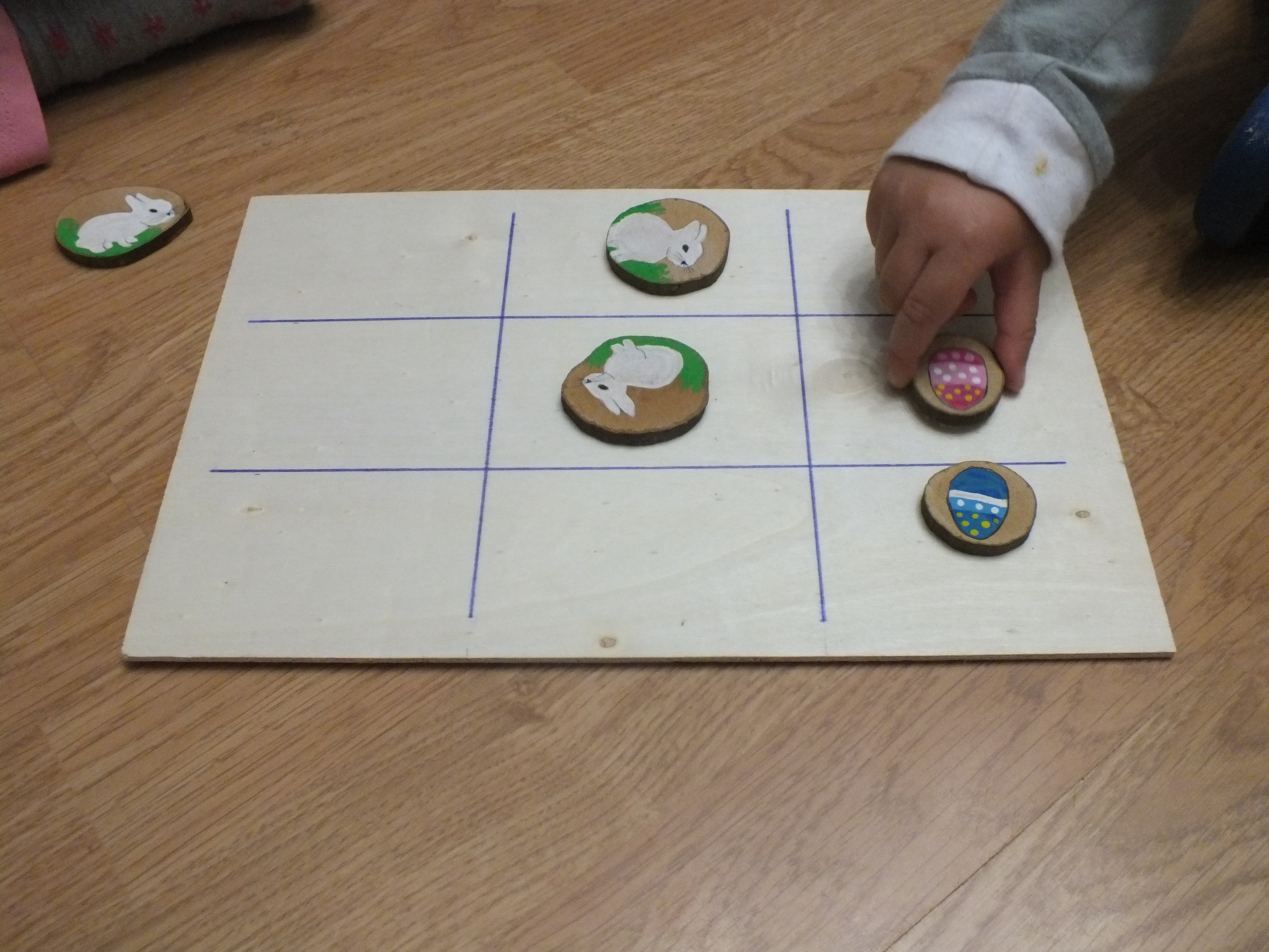 En Pascuas siempre leemos el cuento de «Érase una liebre de Pascua» que les contamos por primera vez el año pasado (os lo escribí en esta entrada), vamos a buscar huevos de Pascua, comemos mona de Pascua y volamos cometas, pero este año hemos introducido una actividad más, jugar al Tres en Raya de Pascua DIY, os cuento cómo lo he hecho.