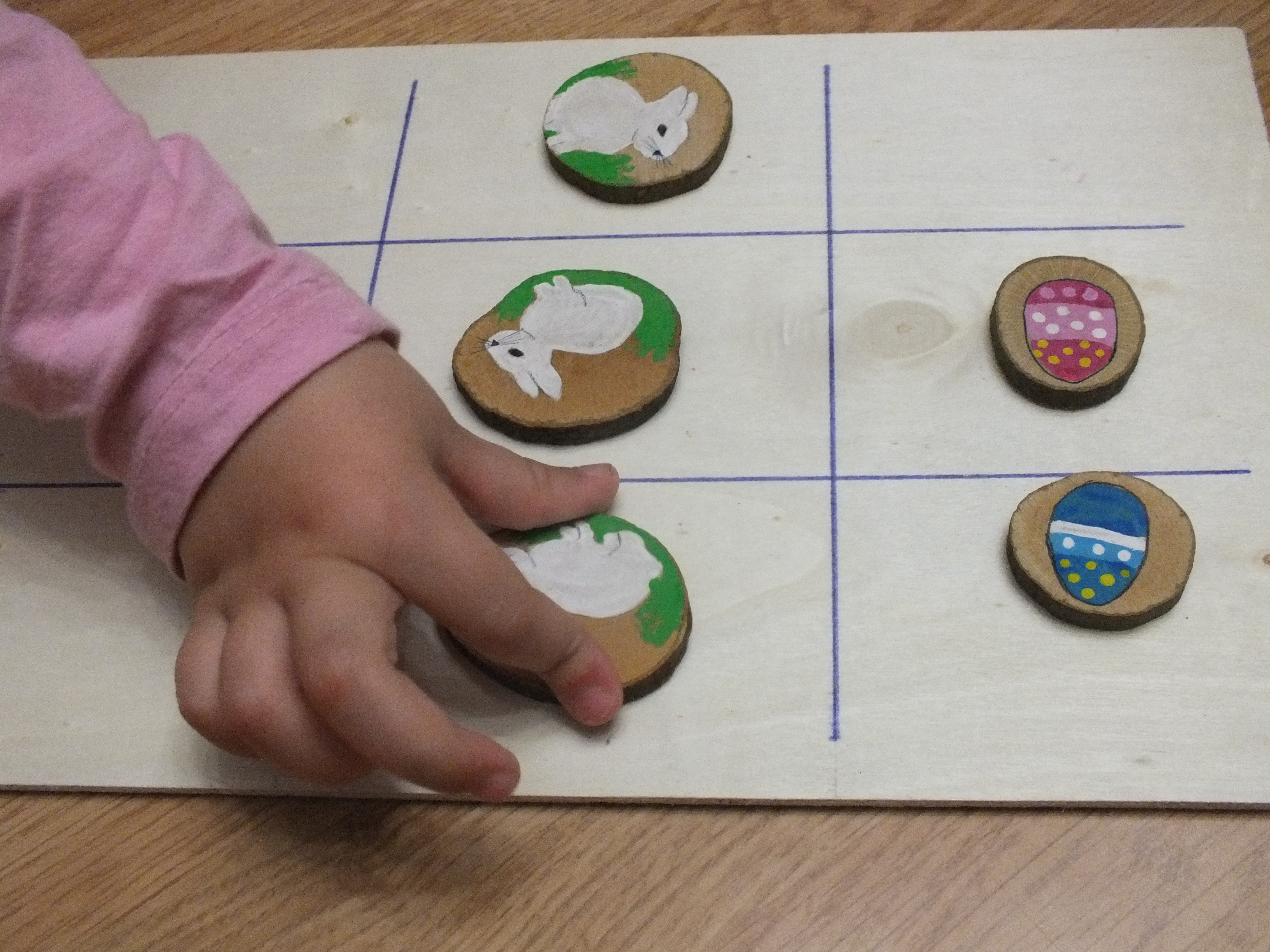 Aplicado al juego que hemos hecho DIY, hay dos jugadores, uno tiene las fichas del conejo de Pascua y el otro las de los huevos de Pascua, hay tres fichas para cada uno (tres conejos y tres huevos).