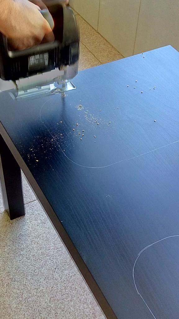 A continuación, preparamos la caladora y la taladradora e hicimos un agujero con la taladradora en una de las siluetas de las cajas para poder meter la hoja de la caladora en la mesa.