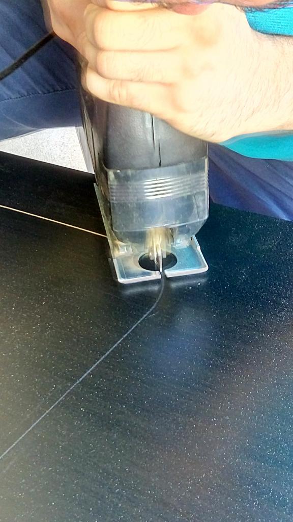Con la caladora, repasamos el perfil de la caja para hacer el agujero donde la colocaremos.