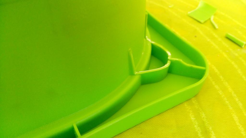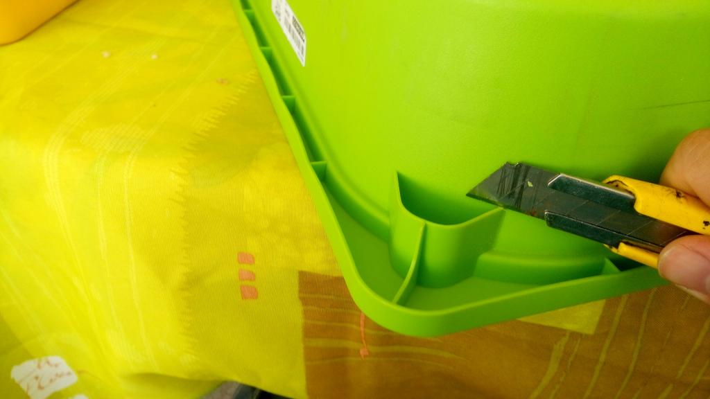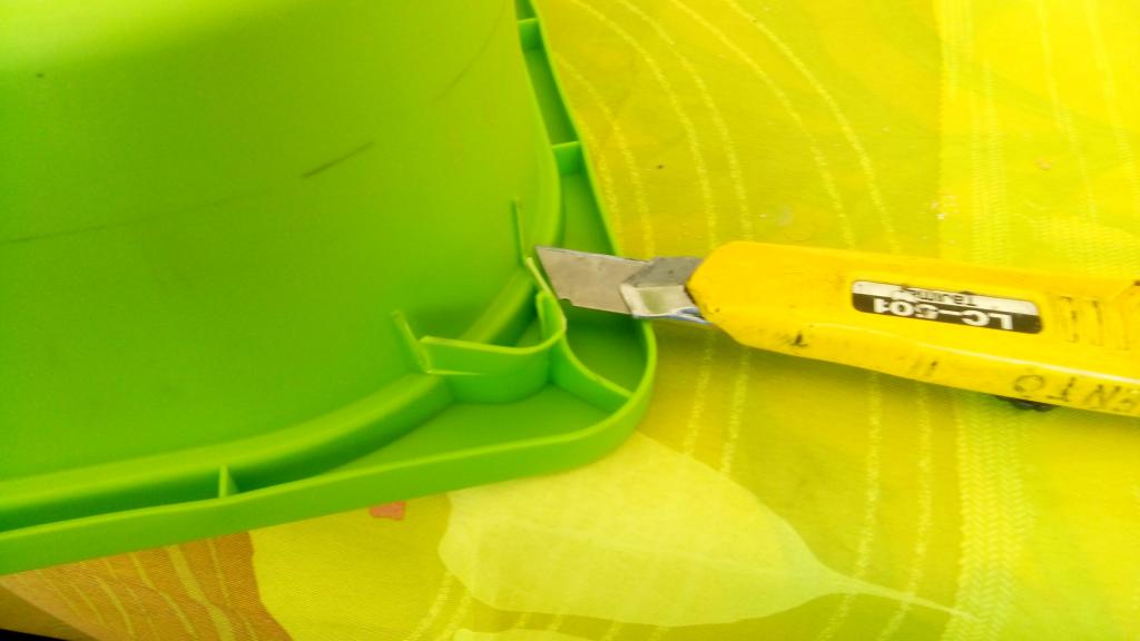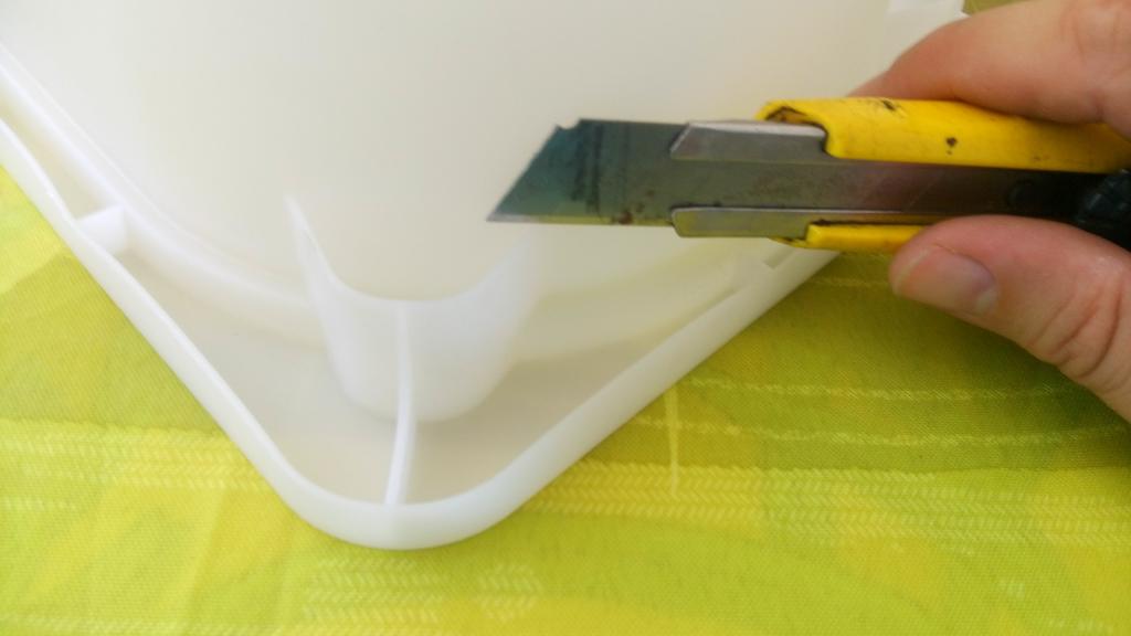 Después, recortamos con un cutter las pestañas que llevan por abajo las cajas para poder introducirlas en el agujero de la mesa, ya que es más fácil recortar los salientes de las pestañas que recortar con la caladora ese perfil en la mesa.