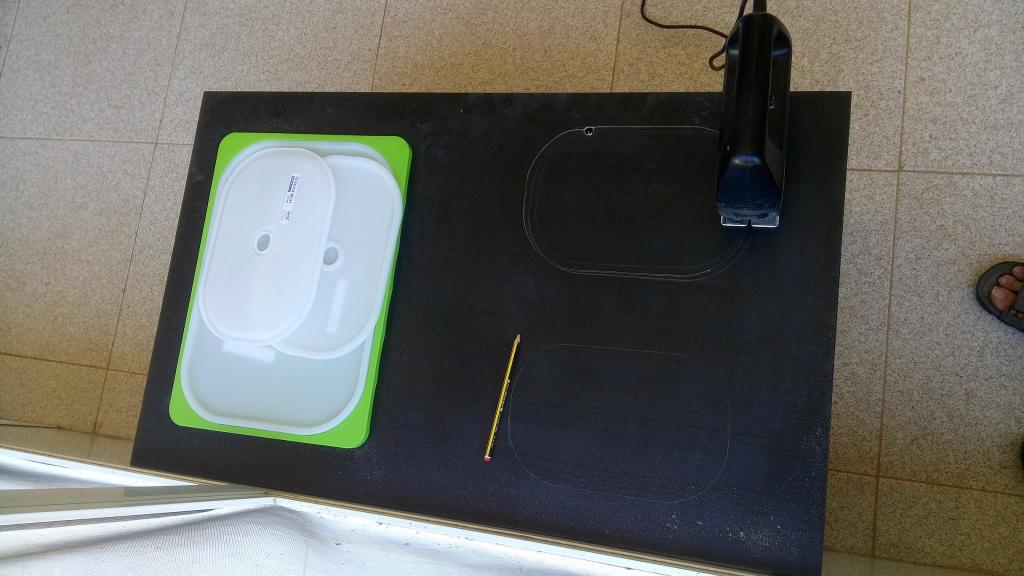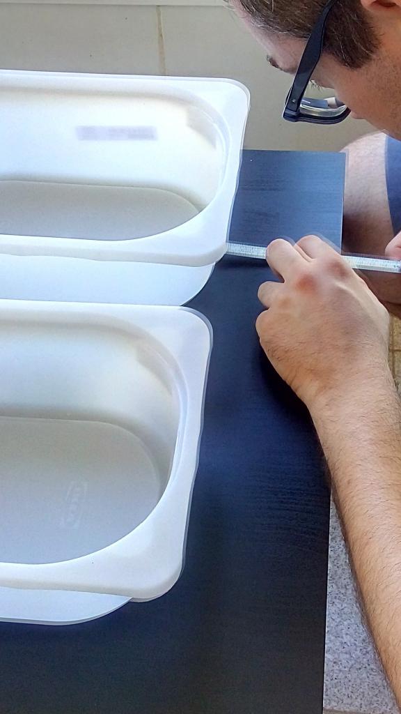 Una vez tuvimos montada la mesa sin la tabla para poner revistas, colocamos las cajas en el lugar donde queríamos ponerlas, medimos la distancia entre ellas y hasta el borde de la mesa y marcamos su perfil con un lápiz.